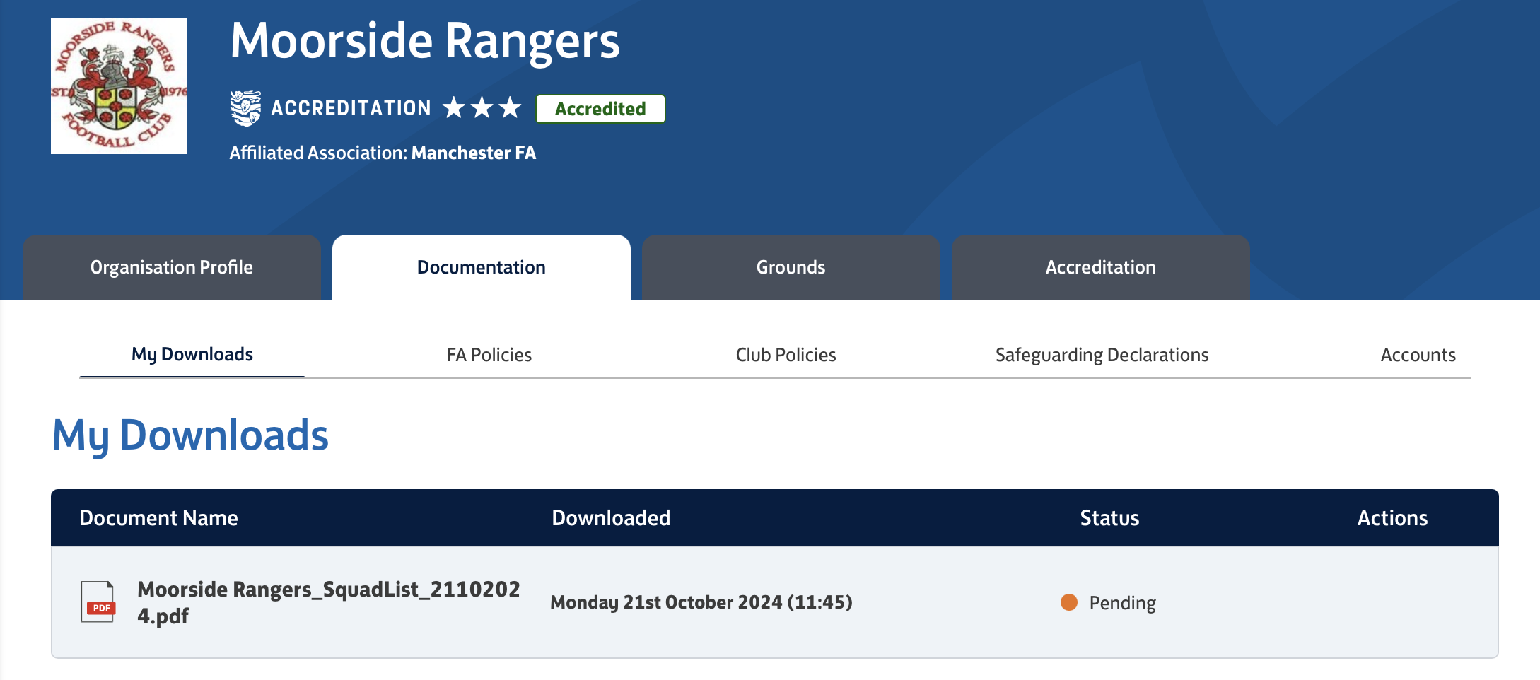 Click on MyClub on the left and then the Documentation Tab. You will see the file you have just asked for. Once it is complete a download icon will appear